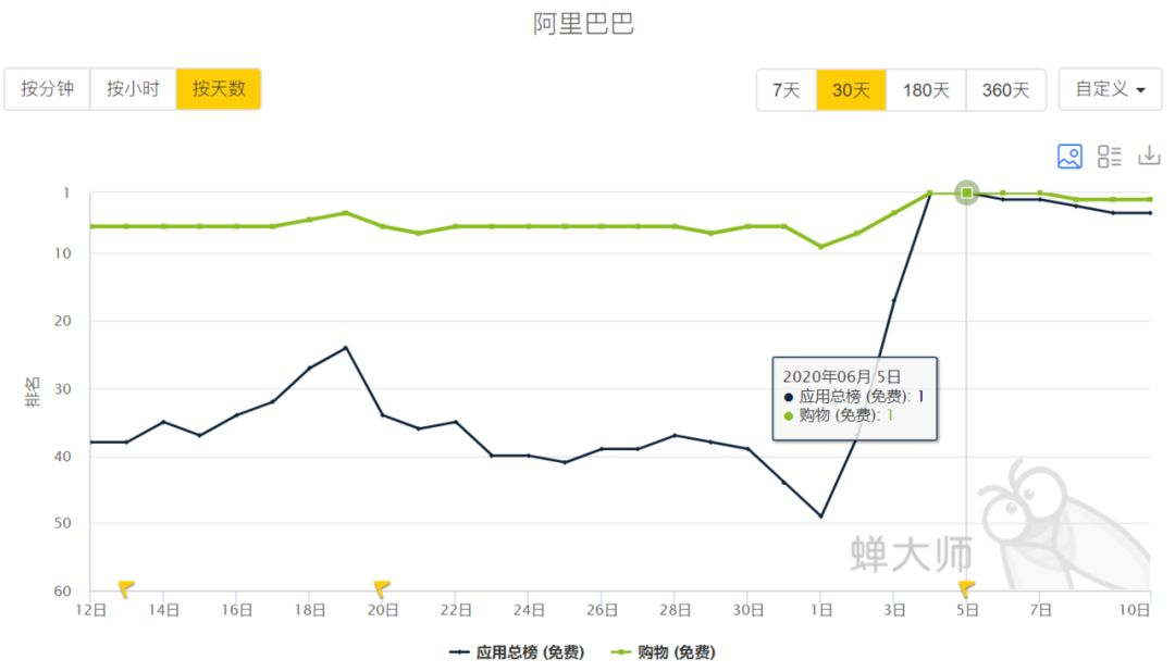 可以说阿里巴巴的帮扶计划拿出了足够的诚意,这也让他们成功吸引到了不少用户。根据蝉大师数据显示,在过去几天,阿里巴巴App排名持续上升,并于6月4日、5日两天霸榜App Store总榜,目前也稳定在应用总榜、购物(免费)榜前列。