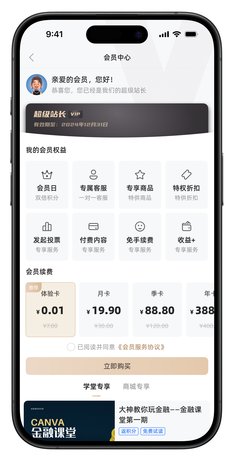 采用V5新版设计风格,新版支持展示部分会员专享商城商品和学堂课程。