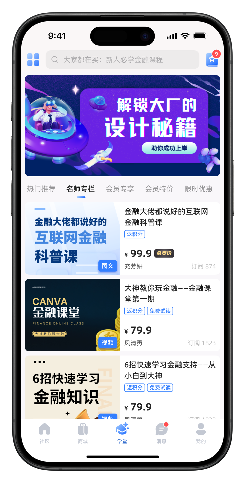 学堂页面与商城页面同样采用了新版的设计风格,并采用与社区同主题色的设计,兼容旧版本的自定义栏目功能,首页内容更加简洁和直观。