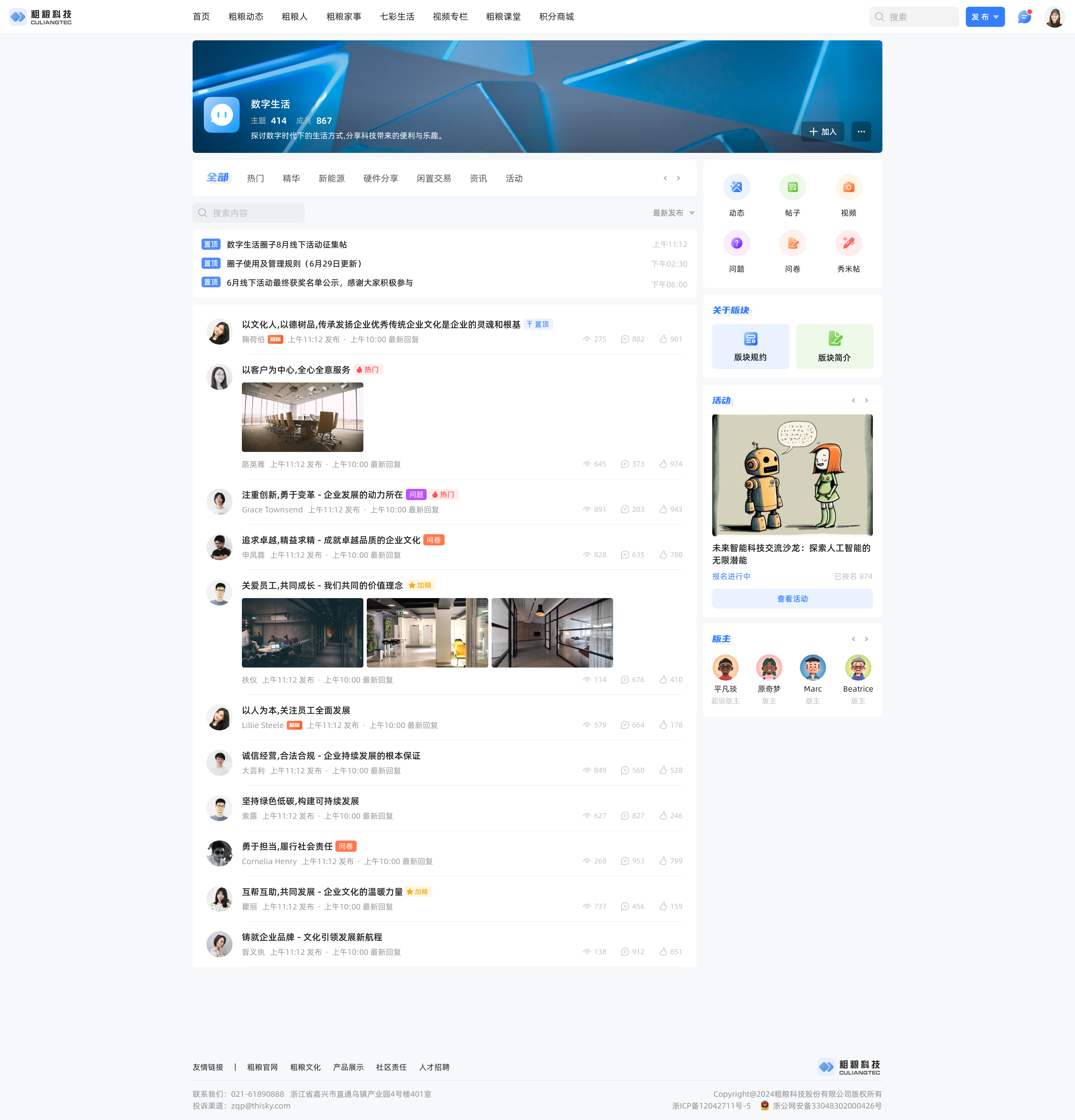 PC端UI开始进入V5版本阶段,在保留原有的主题风格的基础上,新增了一种主题,支持管理员根据社区运营需要切换选择(PS:主题的更新很多客户都跟我们反馈过,安排~);在新版风格中已经对主要页面进行了较大优化改版,包括主要的频道列表页面,版块主页和个人主页,采用了更加简洁和大气的UI风格,适合企业内部社区、兴趣社区、垂直行业社区、校园社区等等,适用性更加广泛。