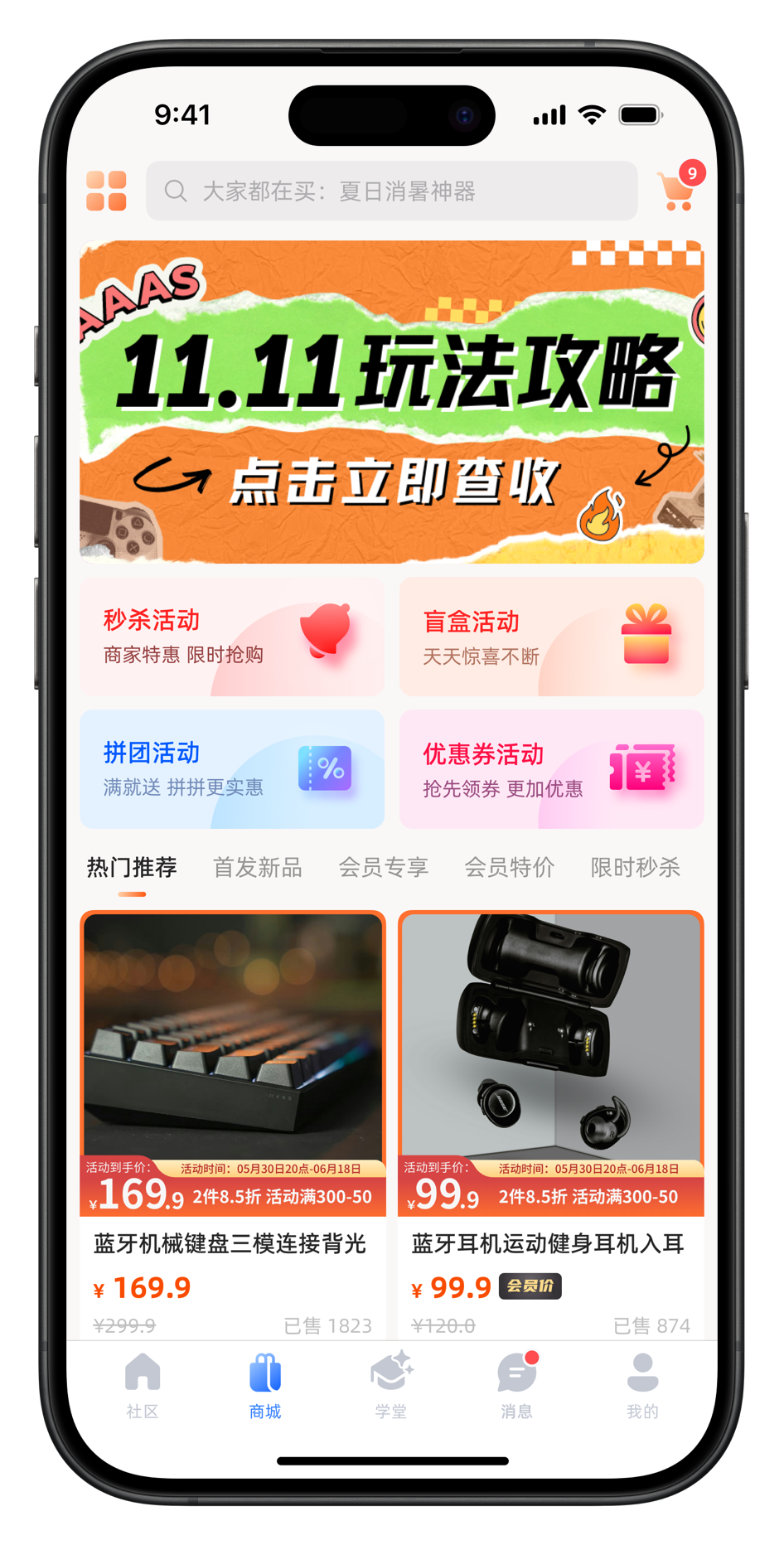 商城页面全新采用V5新版风格,新增了一种导航菜单设计,同时新增支持自定义栏目功能,社区管理员可以根据需求灵活配置首页展示内容。
