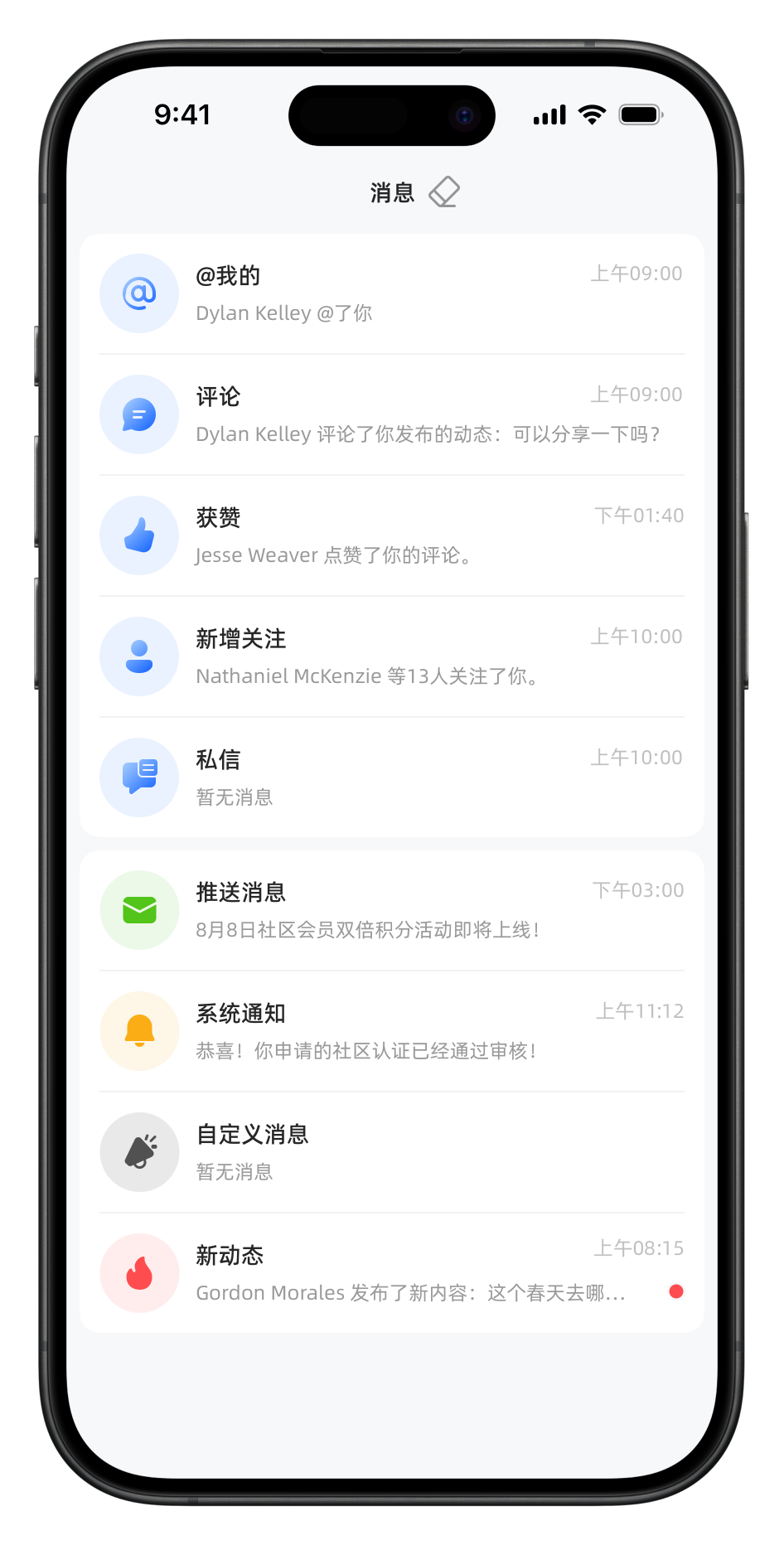 消息中心各个内部页面采用了V5新版设计风格,同时新增@消息分类。