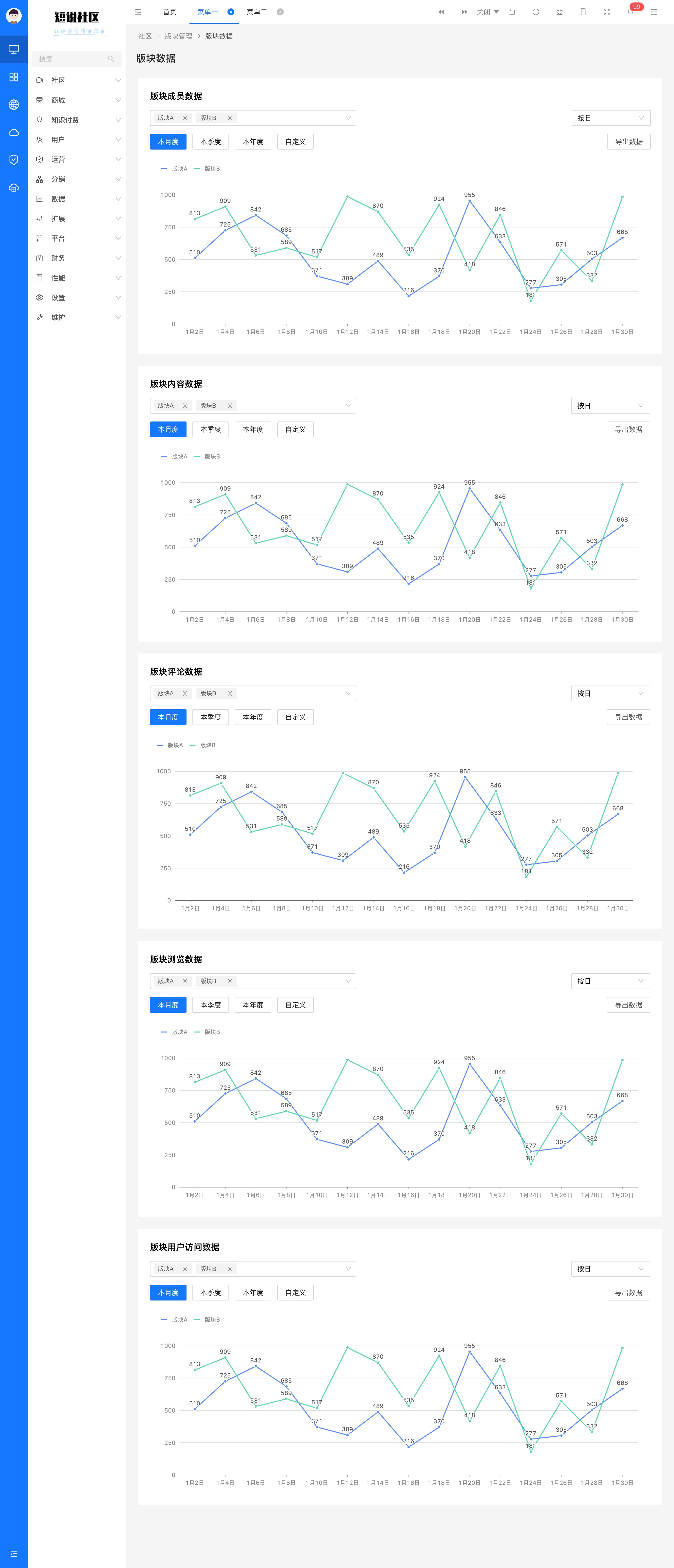 在版块维度,短说支持按月度、季度、年度以及自定义时间范围,全面查看版块的运行情况,包括成员变化趋势、内容发布量、评论数据、浏览数据以及用户访问数据等。这些数据帮助社区运营者更直观地了解每个版块的活跃度变化,判断哪些版块在持续成长,哪些版块需要运营介入,为后续内容策划和资源投入提供依据。