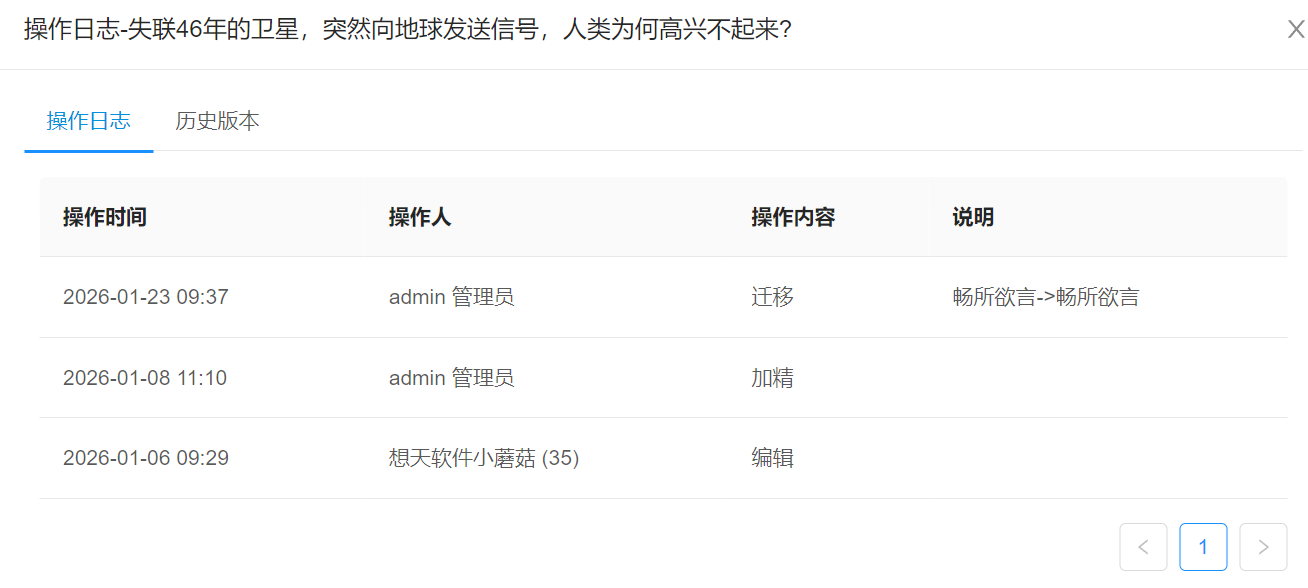 在内容管理方面,后台支持查看每一篇内容的完整操作历史,包括操作时间、操作人、具体操作行为,并支持查看历史版本记录。这一能力让内容管理变得更加透明、可追溯,无论是内容修改、审核调整,还是问题排查,都可以快速还原过程,减少沟通成本。