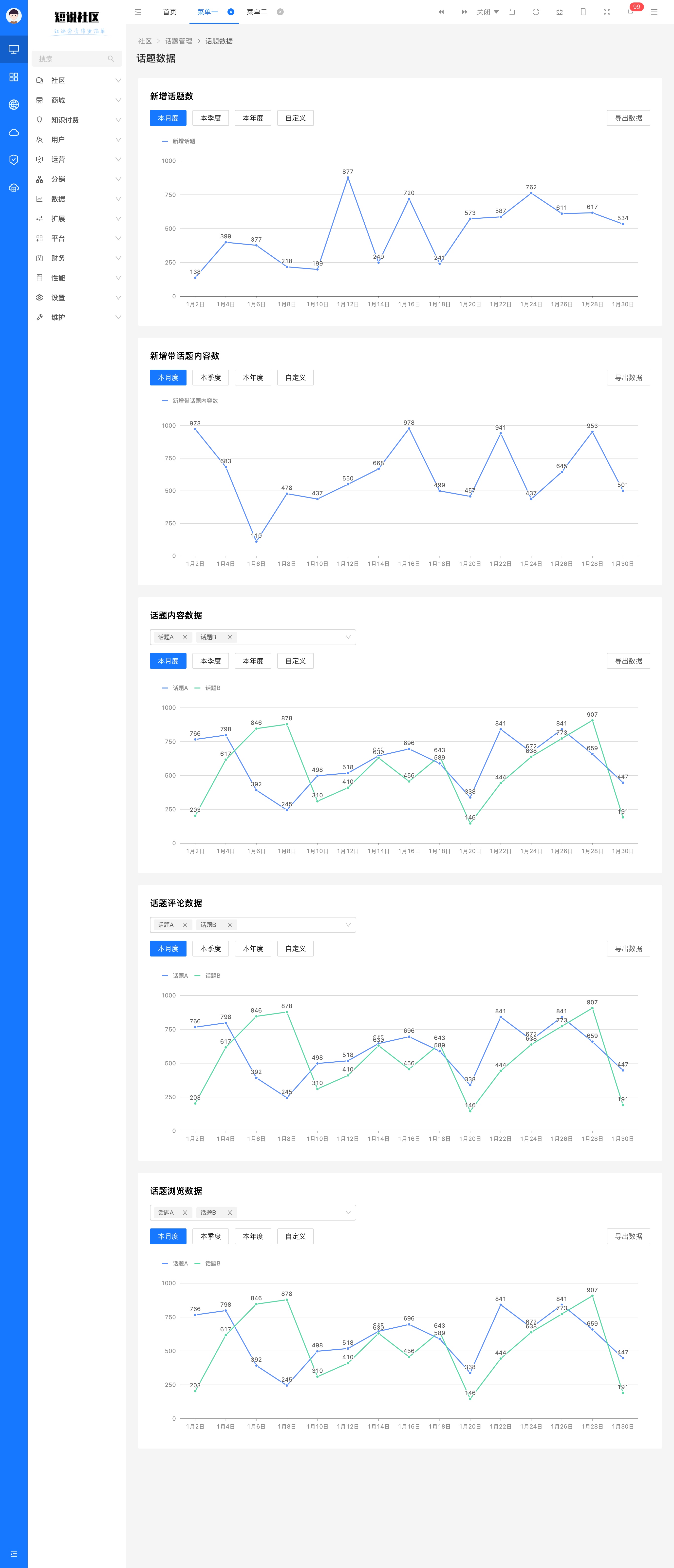 围绕话题运营,系统支持多时间维度统计话题相关数据,包括新增话题数量、新增带话题内容数量、话题内容总量、评论数和浏览数等。通过话题数据,运营者可以快速判断某一话题是否真正被用户接受,是短期热度还是长期内容资产,从而更有针对性地调整话题策略。