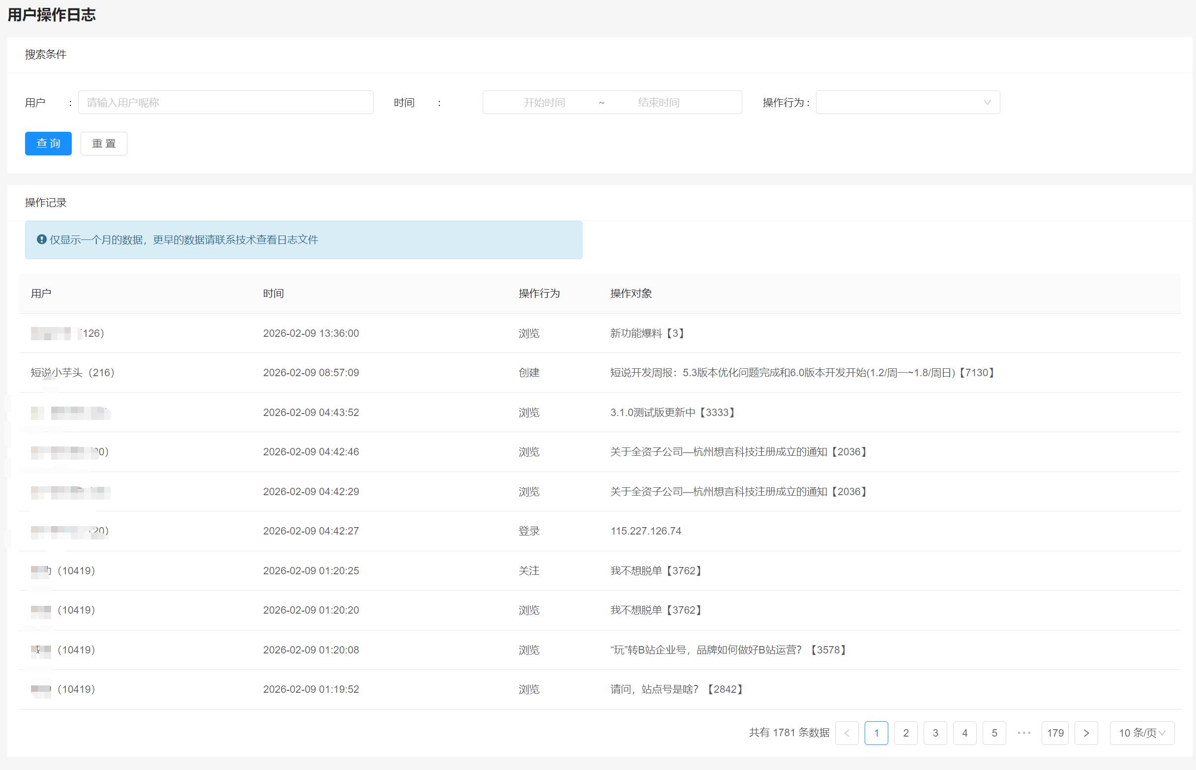 短说在管理后台提供了完整的用户操作日志能力,清晰记录用户在社区中的关键操作行为,包括发生时间、操作内容和操作对象。这不仅有助于问题排查和安全管理,也为后续社区治理、用户行为分析提供了可靠的数据基础。
