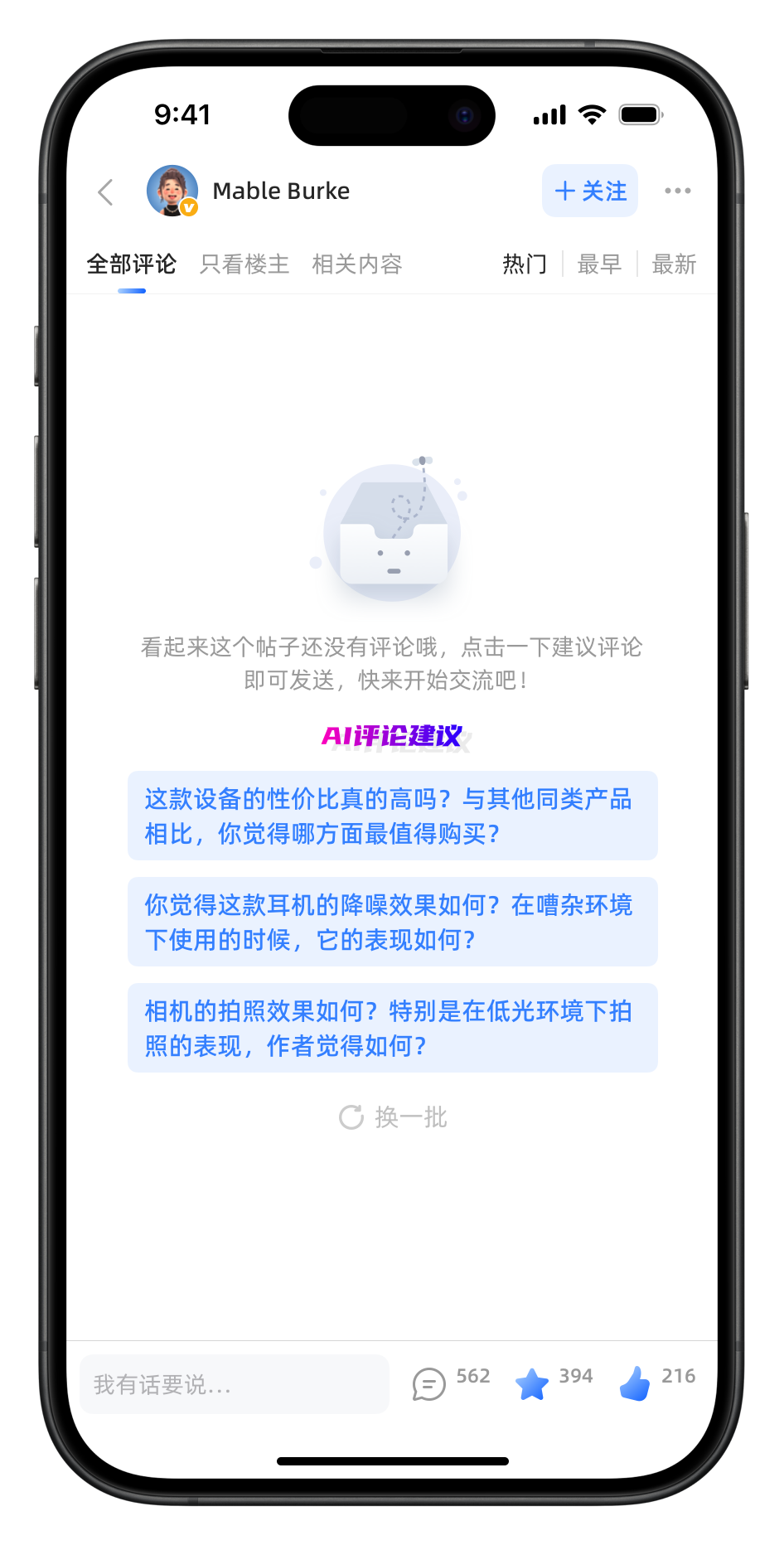 为提升社区用户活跃度,促进用户间互动,短说AI模块推出了AI评论建议功能。针对社区中暂无任何评论的内容,AI会生成相关的评论建议。用户在查看此类内容时,可一键点击评论建议并直接发送,降低互动门槛,激发社区讨论氛围。