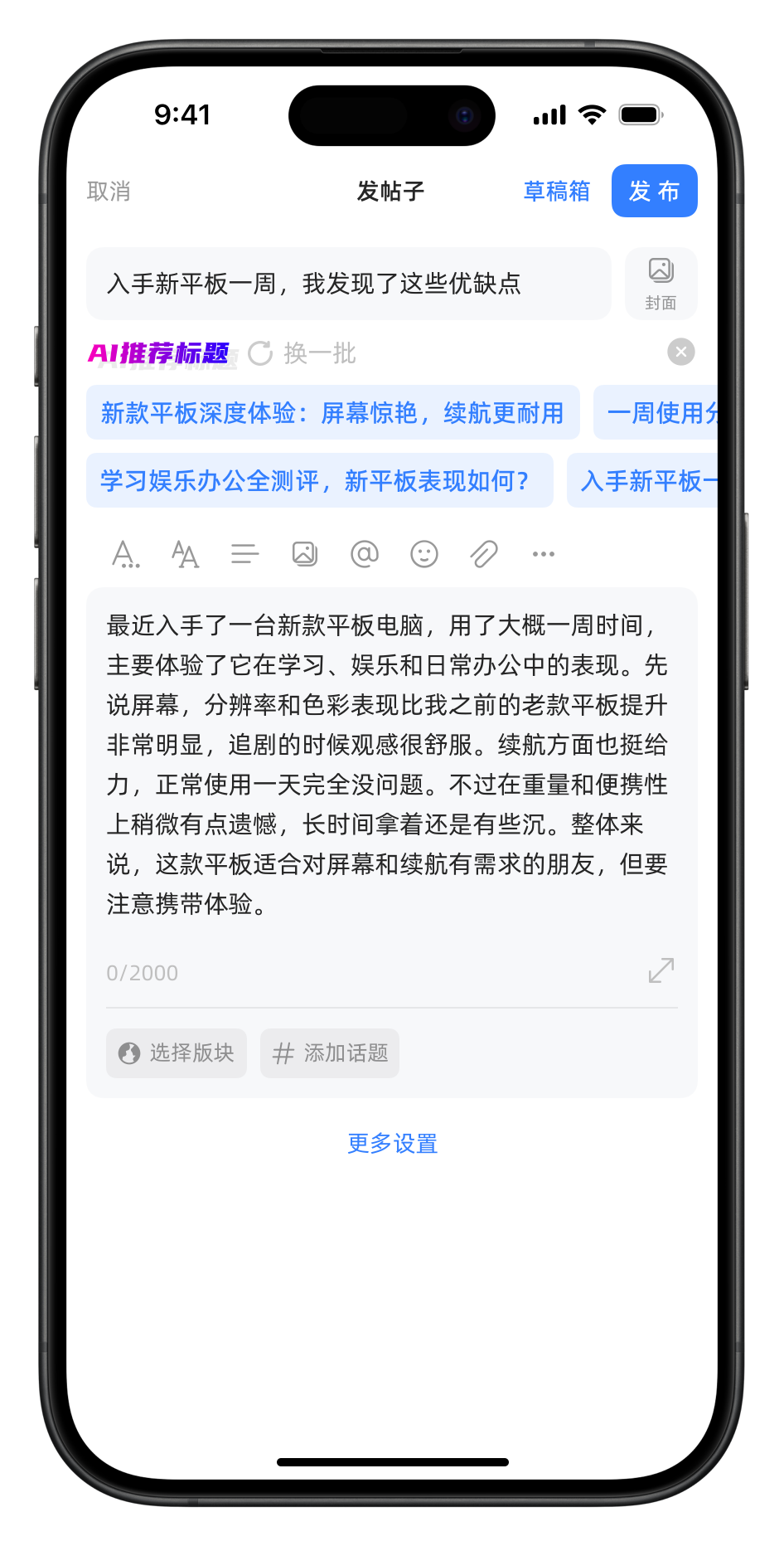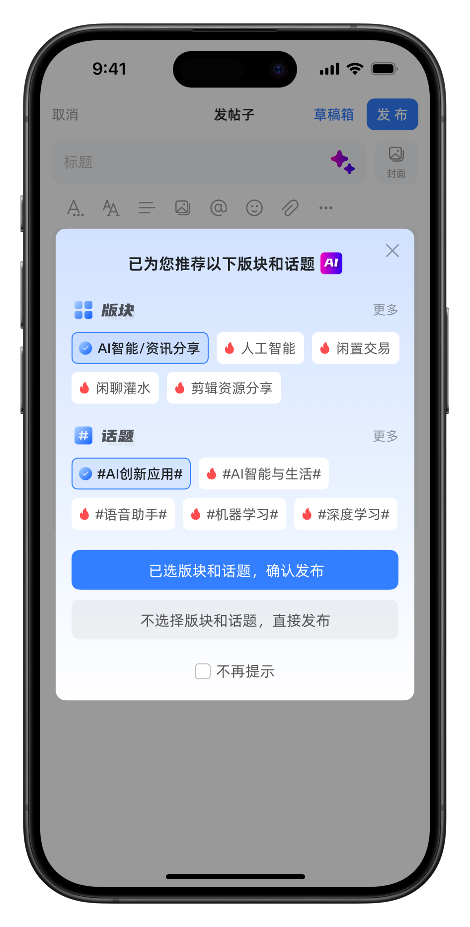 为助力用户在发布内容时快速选择合适的版块或话题标签,短说AI模块提供了AI标签推荐功能。当用户提交发布内容但尚未选择版块或话题时,AI会基于当前内容自动生成推荐的版块和话题标签,方便用户一键添加。同时,系统提供了功能开关,用户可根据自身需求在设置页面自由选择开启或关闭该功能,有效避免过度提示对创作体验造成干扰。