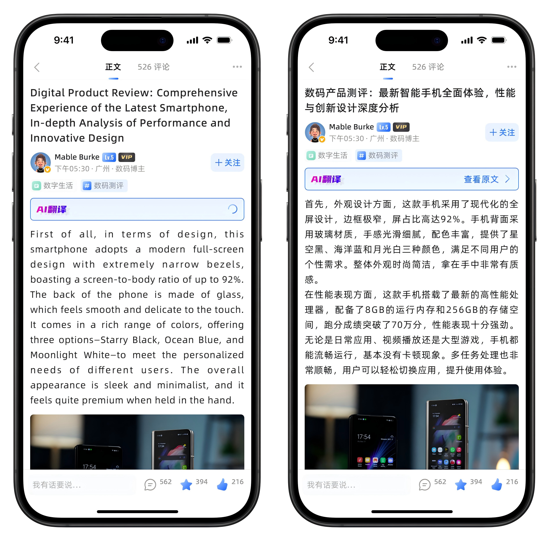 部分社区存在大量海外用户或社区本身主要服务于海外用户,短说AI模块特别集成了AI翻译功能。用户可一键点击翻译文章内容或评论内容,目前已支持中英文互翻。同时,用户可根据个人需求选择默认的翻译语言,打破语言壁垒,促进跨语言交流。