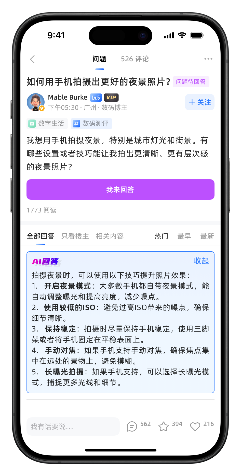 本次V6.0.0版本为社区加入了众多AI功能:① AI标题优化、②AI标签推荐、③AI评论建议、④长文摘要、⑤AI问答助手、⑥AI翻译、⑦AI智能配图等7个功能模块,全面覆盖社区内容创作与互动的多个环节。